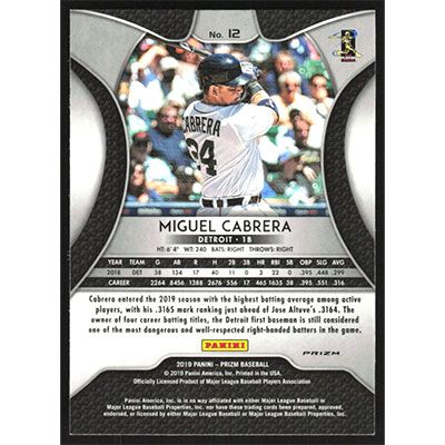 This is a 2019 Panini Prizm Purple Miguel Cabrera baseball card. The card is #12 and pictures show condition.