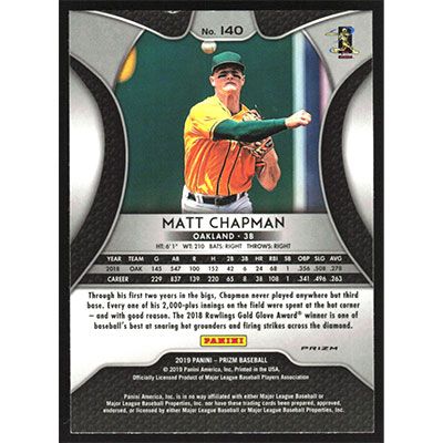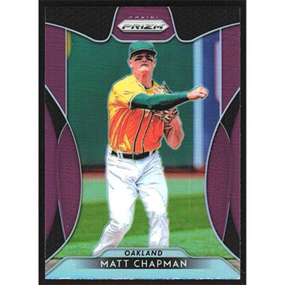 This is a 2019 Panini Prizm Purple Matt Chapman baseball card. The card is #140 and pictures show condition.