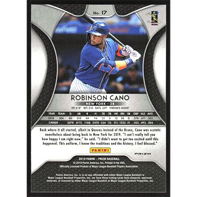 This is a 2019 Panini Prizm Purple Robinson Cano baseball card. The card is #17 and pictures show condition.