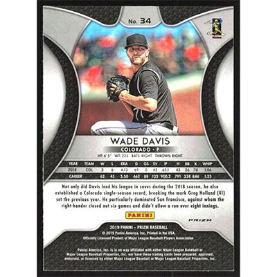 This is a 2019 Panini Prizm Red Wade Davis baseball card. The card is #34 and pictures show condition.