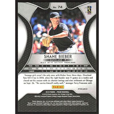 This is a 2019 Panini Prizm Red White and Blue Shane Bieber baseball card. The card is #74 and pictures show condition.