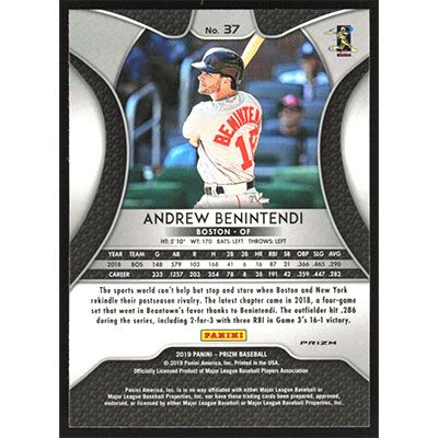 This is a 2019 Panini Prizm Silver Andrew Benintendi baseball card. The card is #37 and pictures show condition.