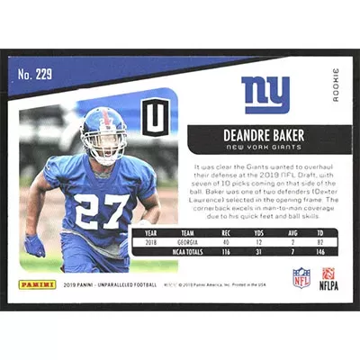 This is a 2019 Panini Unparalleled Deandre Baker football card. The card is #229 and pictures show condition.
