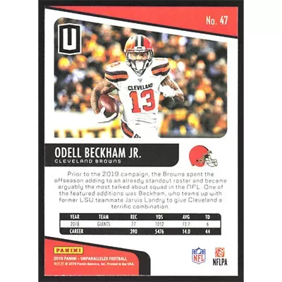 This is a 2019 Panini Unparalleled Odell Beckham Jr. football card. The card is #47 and pictures show condition.