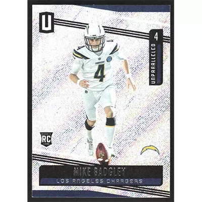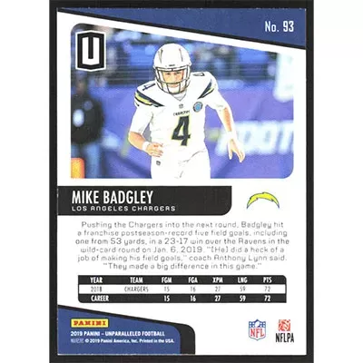 This is a 2019 Panini Unparalleled Mike Badgley football card. The card is #93 and pictures show condition.