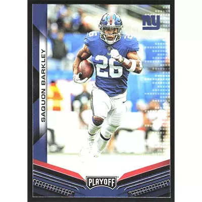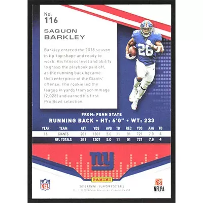 This is a 2019 Playoff Saquon Barkley football card. The card is #116 and pictures show condition.
