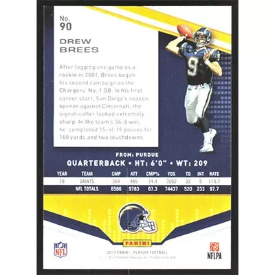 This is a 2019 Playoff Drew Brees football card. The card is #90 and pictures show condition.