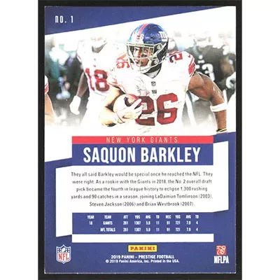 This is a 2019 Prestige Saquon Barkley football card. The card is #1 and pictures show condition.