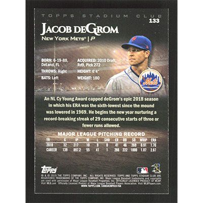 This is a 2019 Stadium Club Jacob deGrom baseball card. The card is #133 and pictures show condition.