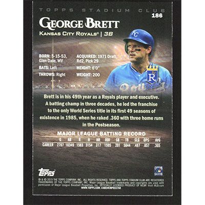 This is a 2019 Stadium Club George Brett baseball card. The card is #186 and pictures show condition.