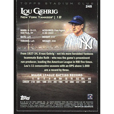 This is a 2019 Stadium Club Lou Gehrig baseball card. The card is #245 and pictures show condition.