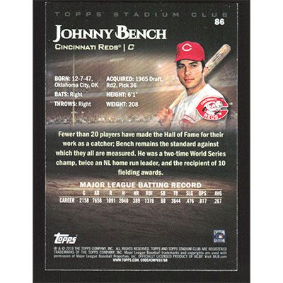 This is a 2019 Stadium Club Johnny Bench baseball card. The card is #86 and pictures show condition.