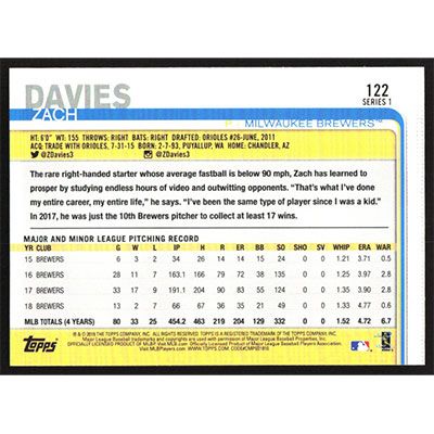 This is a 2019 Topps Zach Davies baseball card. The card is #122 and pictures show condition.