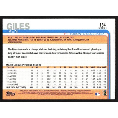 This is a 2019 Topps Ken Giles baseball card. The card is #184 and pictures show condition.