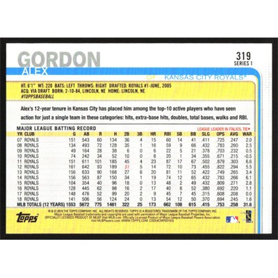 This is a 2019 Topps Alex Gordon autographed baseball card. This card has been signed, in blue, by Alex Gordon, and is guaranteed authentic by Ballcardz.com. The card is #319 and pictures show condition.