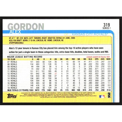 This is a 2019 Topps Alex Gordon baseball card. The card is #319 and pictures show condition.