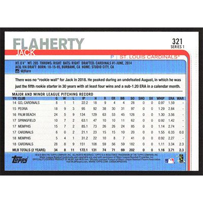 This is a 2019 Topps Jack Flaherty Future Stars baseball card. The card is #321 and pictures show condition.