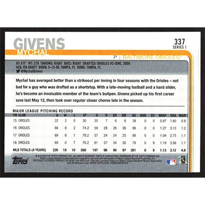 This is a 2019 Topps Mychal Givens baseball card. The card is #337 and pictures show condition.