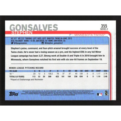 This is a 2019 Topps Stephen Gonsalves baseball card. The card is #355 and pictures show condition.