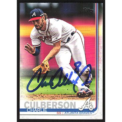 This is a 2019 Topps Charlie Culberson autographed baseball card. This card has been signed, in blue, by Charlie Culberson, and is guaranteed authentic by Ballcardz.com. The card is #369 and pictures show condition.