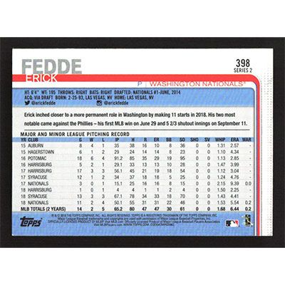 This is a 2019 Topps Erick Fedde baseball card. The card is #398 and pictures show condition.