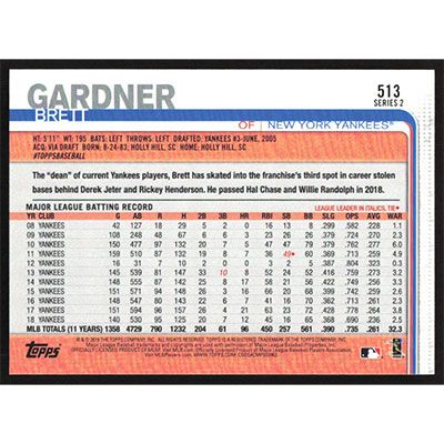 This is a 2019 Topps Brett Gardner baseball card. The card is #513 and pictures show condition.