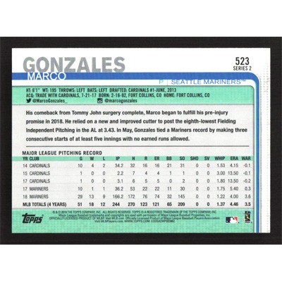 This is a 2019 Topps Marco Gonzales baseball card. The card is #523 and pictures show condition.