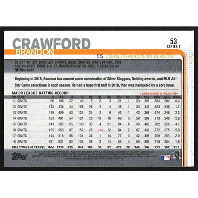 This is a 2019 Topps Brandon Crawford baseball card. The card is #53 and pictures show condition.