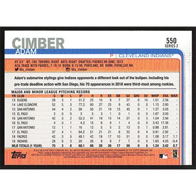 This is a 2019 Topps Adam Cimber autographed baseball card. This card has been signed, in blue, by Adam Cimber, and is guaranteed authentic by Ballcardz.com. The card is #550 and pictures show condition.