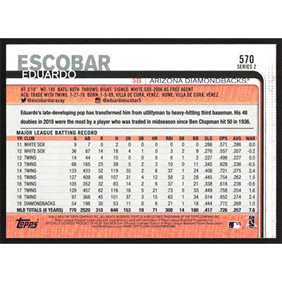 This is a 2019 Topps Eduardo Escobar baseball card. The card is #570 and pictures show condition.