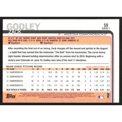 This is a 2019 Topps Zack Godley baseball card. The card is #59 and pictures show condition.