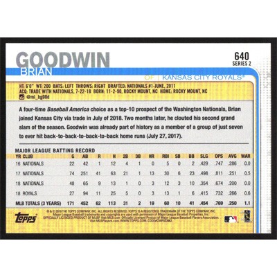 This is a 2019 Topps Brian Goodwin baseball card. The card is #640 and pictures show condition.