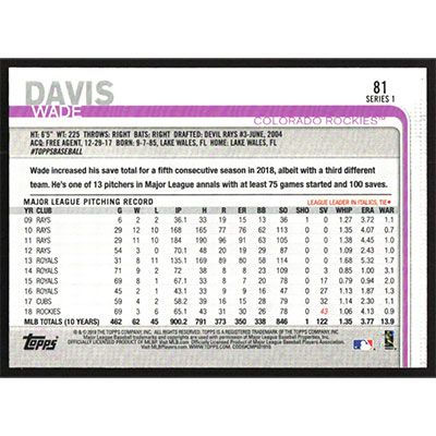 This is a 2019 Topps Wade Davis baseball card. The card is #81 and pictures show condition.