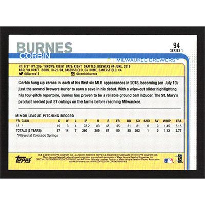 This is a 2019 Topps Corbin Burnes baseball card. The card is #94 and pictures show condition.