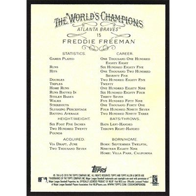 This is a 2019 Topps Allen & Ginter Freddie Freeman baseball card. The card is #15 and pictures show condition.