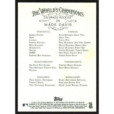 This is a 2019 Topps Allen & Ginter Wade Davis short print baseball card. The card is #376 and pictures show condition.