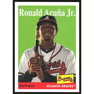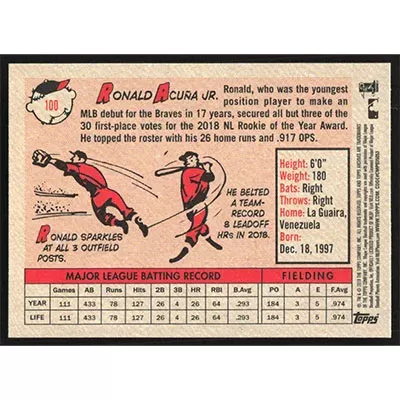 This is a 2019 Topps Archives Ronald Acuña Jr. baseball card. The card is #100 and pictures show condition.