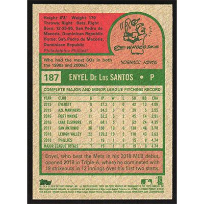 This is a 2019 Topps Archives Enyel De Los Santos baseball card. The card is #187 and pictures show condition. Team(s): Philadelphia Phillies Rookie Card (RC)