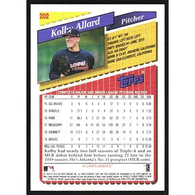 This is a 2019 Topps Archives Kolby Allard baseball card. The card is #202 and pictures show condition.