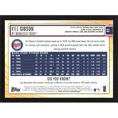 This is a 2019 Topps Big League Kyle Gibson baseball card. The card is #38 and pictures show condition.
