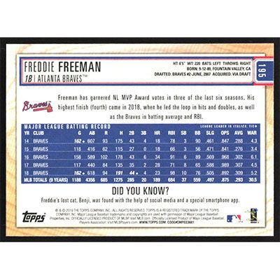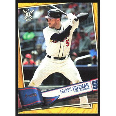 This is a 2019 Topps Big League Gold Freddie Freeman baseball card. The card is #195 and pictures show condition.