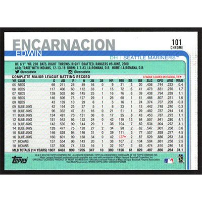 This is a 2019 Topps Chrome Edwin Encarnacion baseball card. The card is #101 and pictures show condition.