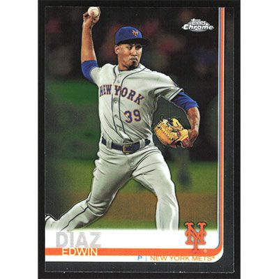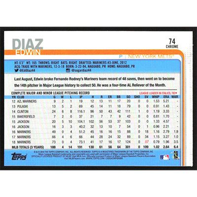 This is a 2019 Topps Chrome Edwin Diaz baseball card. The card is #74 and pictures show condition.