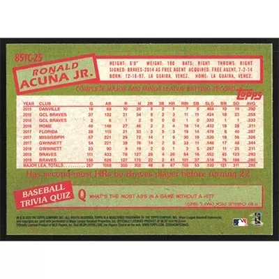 This is a 2019 Topps Chrome '85 Ronald Acuña Jr. baseball card. The card is #85TC-25 and pictures show condition.