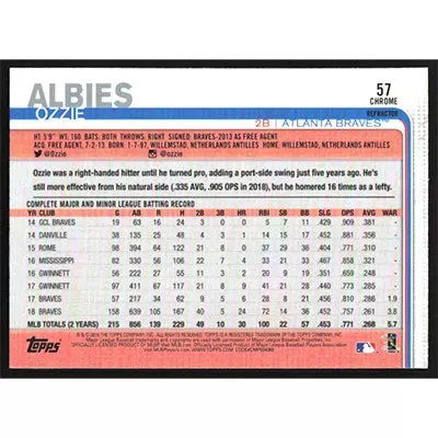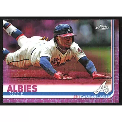 This is a 2019 Topps Chrome Pink Refractor Ozzie Albies baseball card. The card is #57 and pictures show condition.