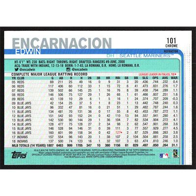 This is a 2019 Topps Chrome Pink Refractors Edwin Encarnacion baseball card. The card is #101 and pictures show condition.