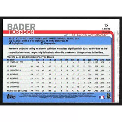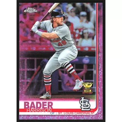 This is a 2019 Topps Chrome Pink Refractors Harrison Bader baseball card. The card is #13 and pictures show condition.