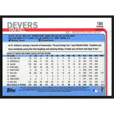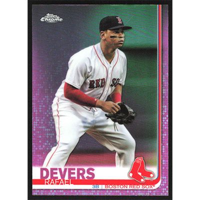 This is a 2019 Topps Chrome Pink Refractors Rafael Devers baseball card. The card is #184 and pictures show condition.
