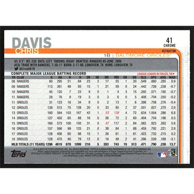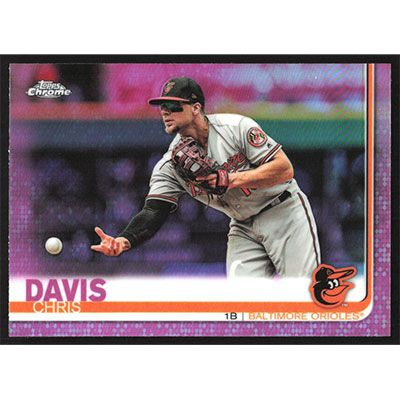 This is a 2019 Topps Chrome Pink Refractors Chris Davis baseball card. The card is #41 and pictures show condition.