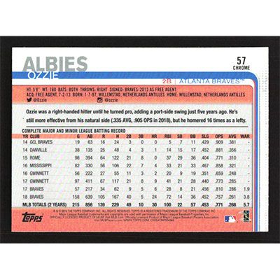This is a 2019 Topps Chrome Prism Refractors Ozzie Albies baseball card. The card is #57 and pictures show condition.